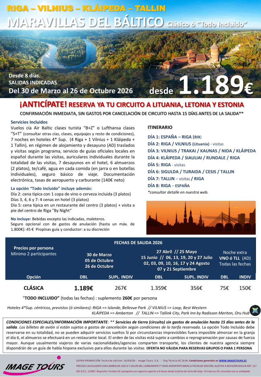 Maravillas del BÁLTICO: circuito MP Vilnius, Riga, Kláipeda, Tallin, visitas incl. Desde 1.189€ hasta Octubre